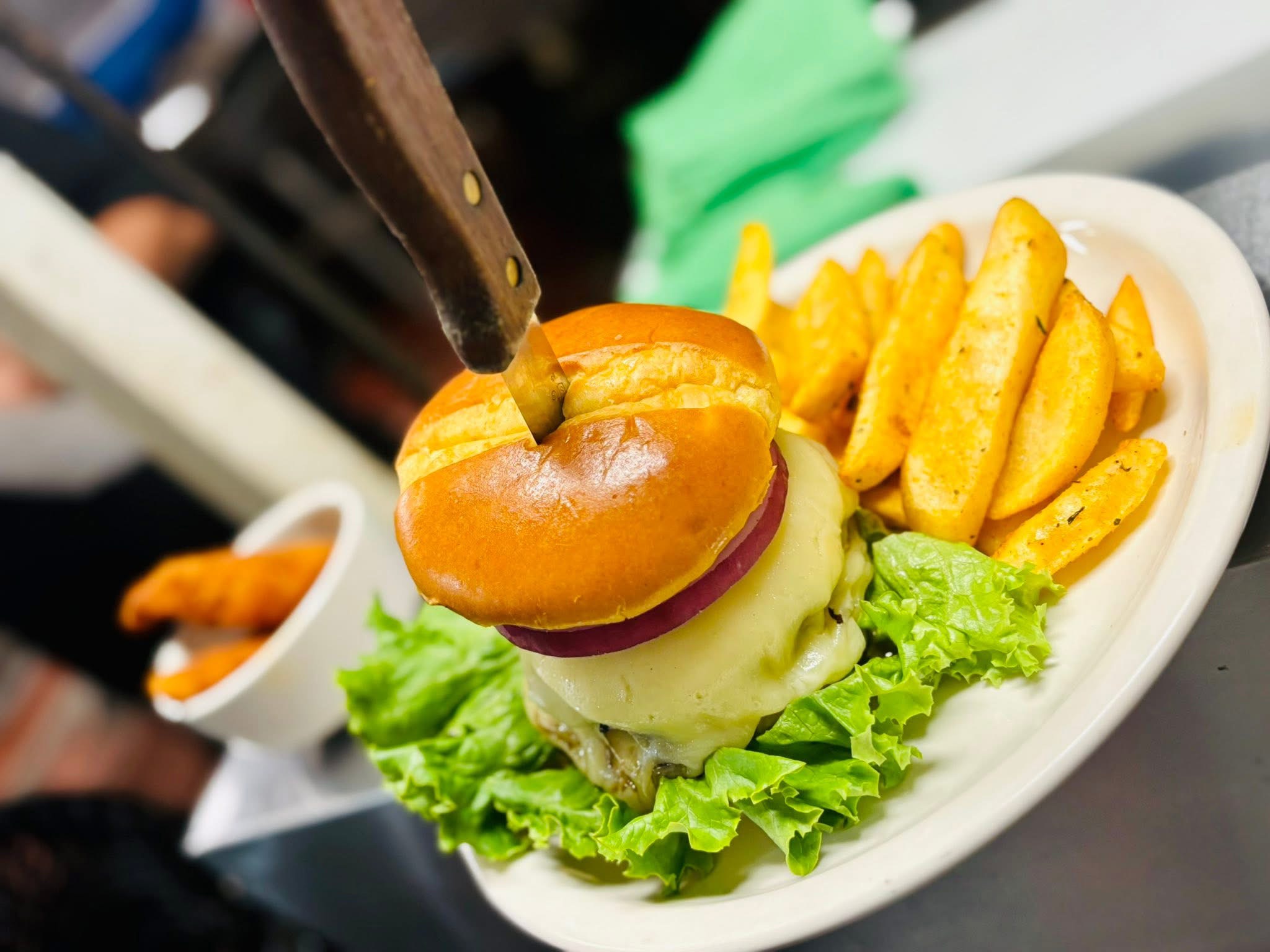 Pulled BBQ pork topped, Hey Be’be’ butter, smoked bacon, cheddar cheese, sour cream, green onions, and crispy onion straws